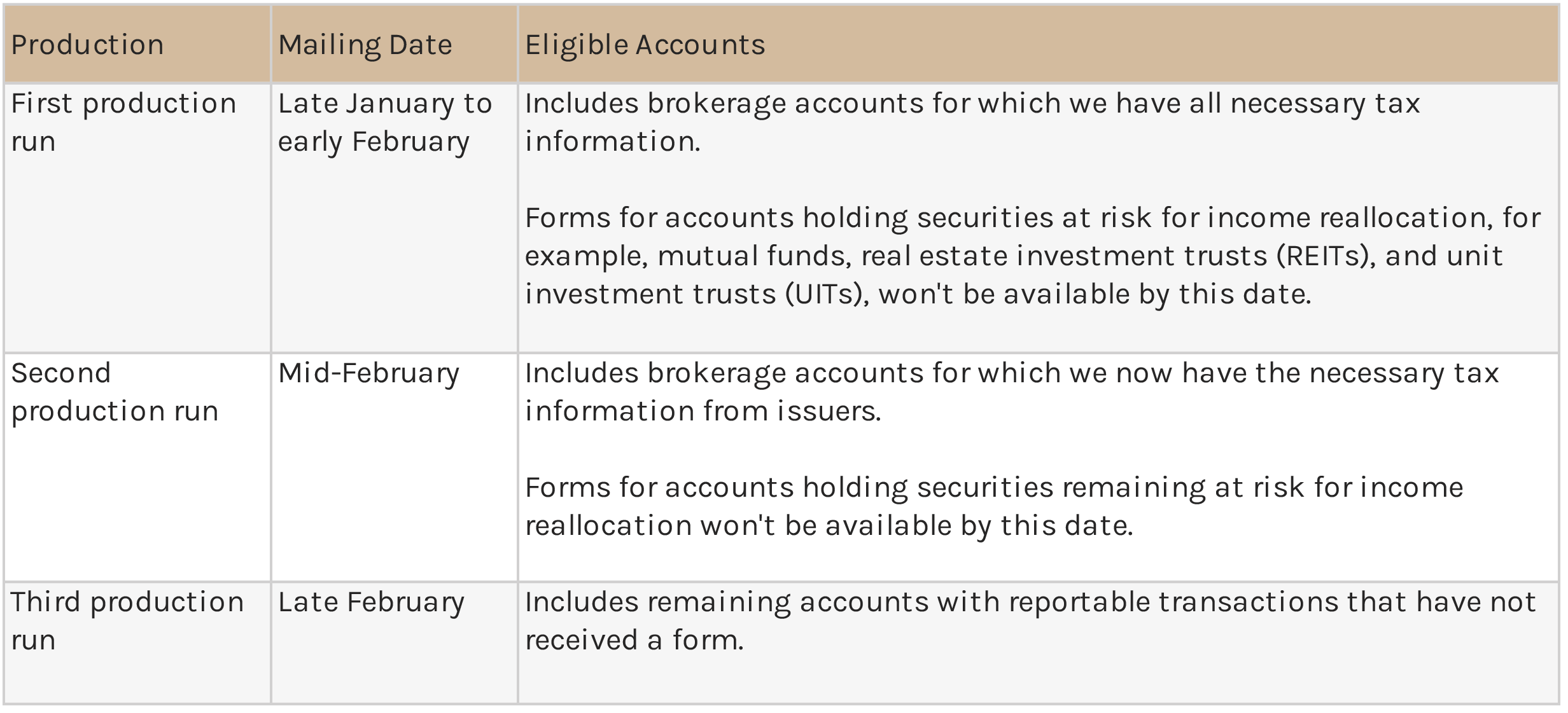 To ensure timely tax reporting while limiting corrections, Schwab produces Form 1099 Composite in three separate production runs, depending on the types of investments held, the reclassification status of dividends received and when trading has occurred in the account. Because many corrected 1099 forms are triggered as a result of securities with reclassified income or wash sales with deferred losses resulting from January purchases, Schwab uses two additional production runs to limit the amount of corrected forms sent to clients.